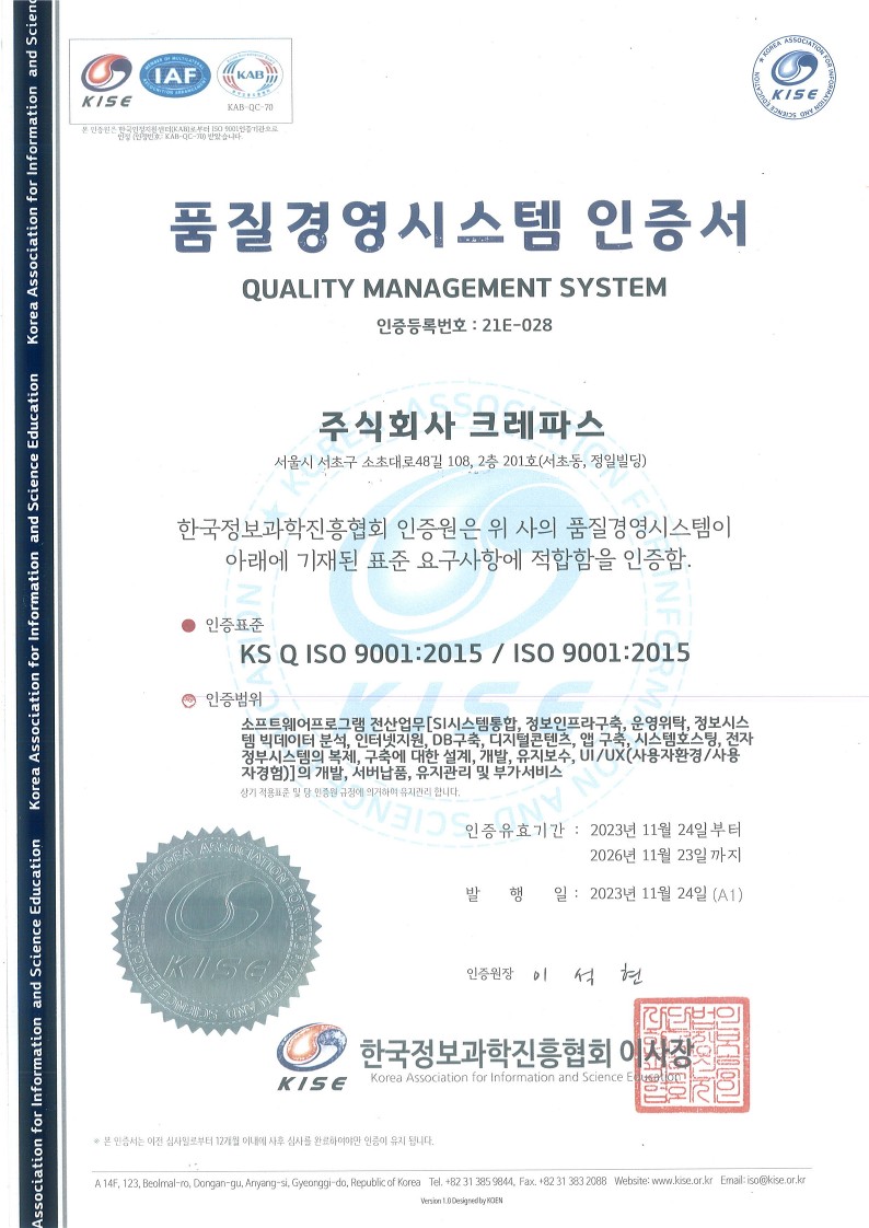 품질경영시스템 인증 - ISO 9001 회득 페이지 정보 작성자 최고관리자 작성일24-11-30 23:56 조회6,867회 댓글0건 관련링크 본문 (주)크레파스 는 소프트웨어프로그램 전산업무 (시스템통합, 정보인프라구축, 운영위탁, 정보시스템 빅데이터분석, 디지털콘텐츠, 앱구축, 시스템호스팅, 전자정부 시스템 구축, 개발, 유지보수 등)범위에 있어서 품질경영시스템 인증을 받았습니다. 댓글목록 등록된 댓글이 없습니다. 이전글 다음글 목록