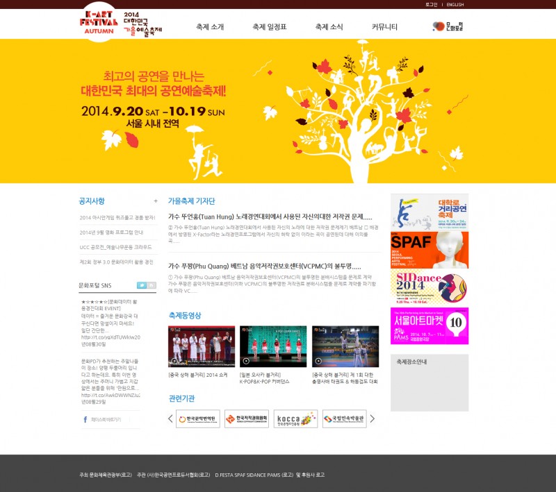 2014 대한민국 가을예술축제는 풍요로운 계절, 가을에 국민들과 관광객들이 계절처럼 풍성한 공연예술을 즐길 수 있도록 다양한 국제공연예술행사들을 연계하여 구성된 대규모 축제입니다. 2000년대을 전후하여 9, 10월이면 우수한 국내외 공연을 선보여 온 서울국제공연예술제(SPAF), 서울세계무용축제(SIDance), 서울아트마켓(PAMS), 대학로거리공연축제(D.FESTA)가 올해 ‘가을예술축제’라는 이름 아래 함께 모였습니다. 연극, 무용, 거리공연 등 함께 해서 더 풍성해진 공연예술행사들을 예술 애호가들뿐 아니라 보다 많은 국민들이 즐길 수 있도록 하는데 ‘가을예술축제’가 탄생한 목적이 있습니다