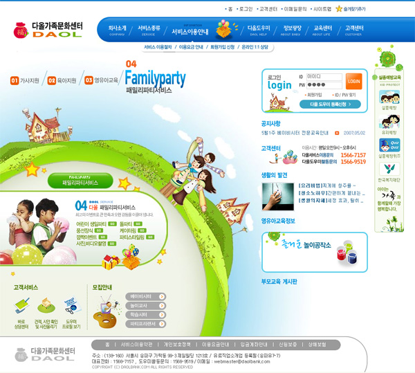 가사지원서비스, 육아지원, 영유아교육, 패밀리파티 서비스를 제공하는 기업으로 다양한 가족의 욕구에 대한 적절한 서비스제공을 목적으로 이번 사이트를 구축하게 되었다.